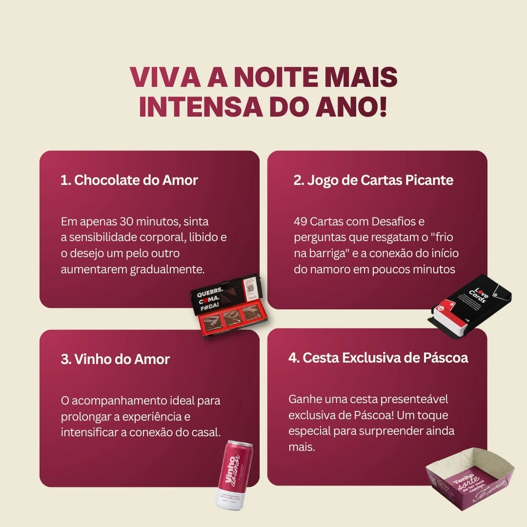 Kits Especiais de Páscoa com até 50% de DESCONTO! Aproveite o menor preço do ano e garanta o presente que vocês dois vão aproveitar juntos.